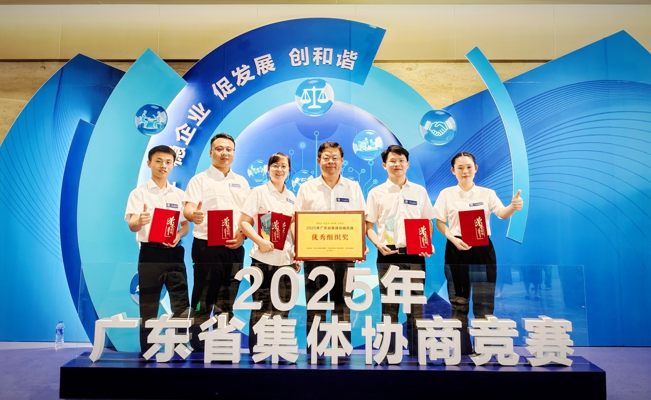 如今,员工代表不仅在本职岗位上发光发热,还将维权服务的能力带到了更广阔的舞台。公司选拔5名员工代表参加2025年广东省集体协商竞赛,他们凭借扎实的政策功底和出色的协商技巧脱颖而出,夺得团体二等奖。