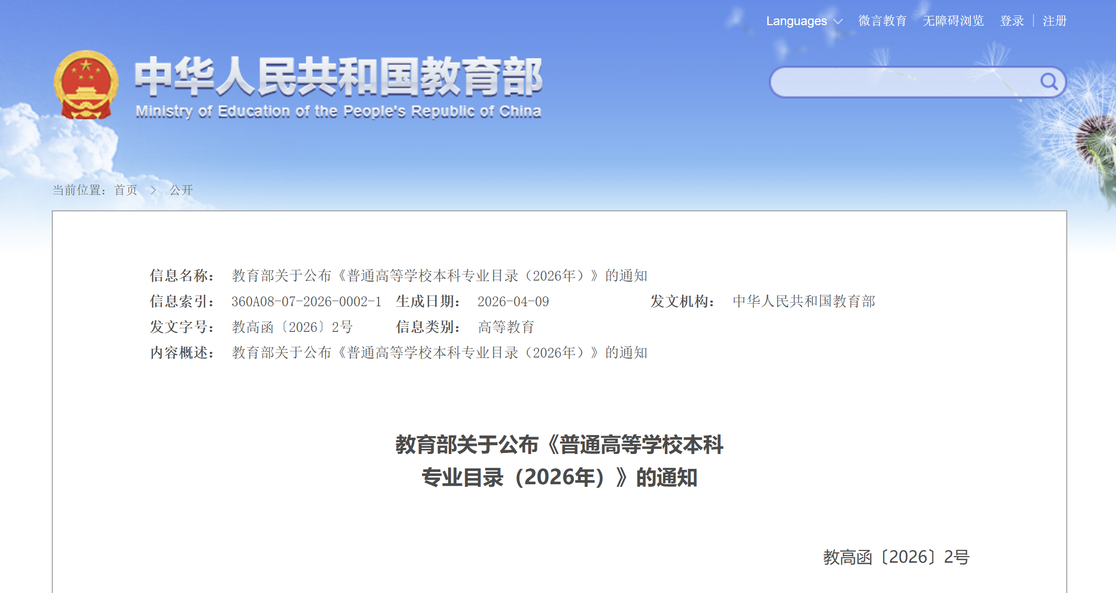 【环球网报道 记者 陈全】4月28日,记者从教育部获悉,《普通高等学校本科专业目录(2026年)》(以下简称《目录》)已于近日公布。